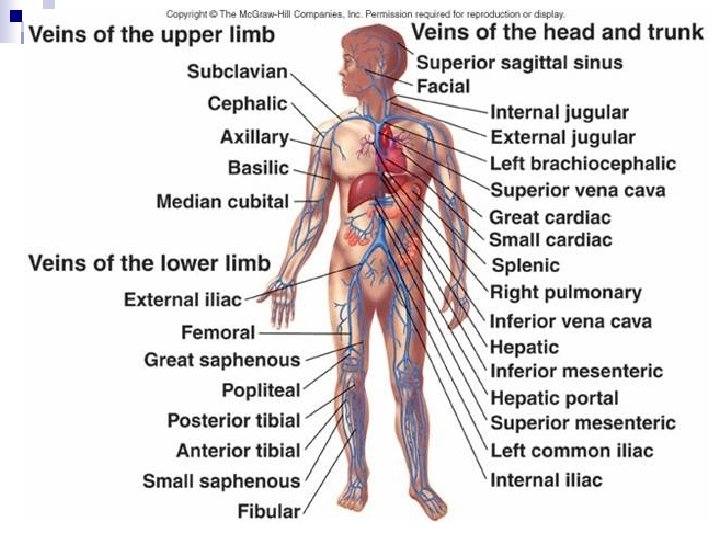 The Systemic Veins n Some Important Veins: Internal & External Jugular Veins: Drain from the sinus veins in the head – internal serves the brain, external serves the structures outside the cranium. ¨ Right & Left Brachiocephalic Veins: Formed by the subclavian & jugular veins uniting on each side & empties directly into the superior vena cava. ¨ Axygos System: Collects blood from the thorax & abdominal wall – can bypass the inferior vena cava & empty into the superior vena cava if the IVC is obstructed. ¨ n ¨ Azygos Vein, Hemiazygos Vein, & accessory veins important here. Great Saphenous Veins: Superficial veins that are the longest in the body – travel from the foot to the groin – most likely to suffer from varicosities due to length & number of valves.