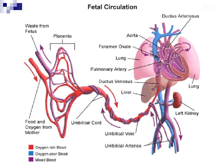 Fetal Circulation n Fetal Circulation: The circulatory system of the fetus. ¨ Fetus obtains oxygen & nutrients & elminates carbon dioxide & other wastes through the umbilical cord & placenta. ¨ Wastes travel from the intervillous spaces in the placenta to the uterine veins to be filtered out by the mother’s cardiovascular system. ¨ Nutrients travel from the maternal blood vessels intervillous spaces of the placenta fetal capiullaries. n Fetal & maternal blood typically do not mix – all exchanges occur through capillary wall diffusion.