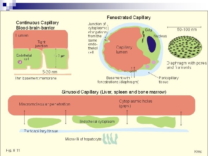 Capillaries n Capillaries: The smallest vessels in the body consisting of a single layer of endothelium. ¨ n Found almost everywhere in the body, but not in tendons, ligaments, or the cornea & lens of the eye. Three Types of Capillaries: ¨ Continuous Capillaries: Continuous tubes formed of endothelial cells – intracellular cleft present for some materials to pass through. n ¨ Fenestrated Capillaries: Fenestrations (holes) along the wall to allow for quicker passage of materials. n ¨ Found in most connective tissue, smooth muscle, lungs, & skeleton. Found in organs that use rapid filtration - small intestine, endocrine glands, kidneys. Sinusoids: Large fenestrations (holes) and large intracellular lefts to allow for easiest passage of materials. n Found in liver, spleen, some glands, red bone marrow.