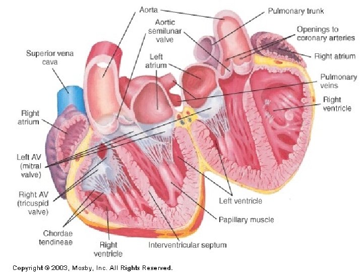 3 Layers of the Heart • Epicardium- same as the visceral layer of the pericardium • Myocardium- thick contractile cardiac muscle cells. The cells are tightly joined together to form a syncytium which transmits action potentials seamlessly. • Endocardium- thin layer that covers muscular projections called trabeculae. This tissue’s folds make up the valves. It is also continuous with lining of blood vessels.