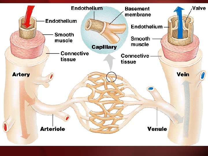 The Cardiovascular System 2. Blood Vessels -A network of tubes –Arteries arterioles move away from the heart • Elastic Fibers • Circular Smooth Muscle –Capillaries – where gas exchange takes place. • One cell thick • Serves the Respiratory System –Veins Venules moves towards the heart • Skeletal Muscles contract to force blood back from legs • One way values • When they break - varicose veins form