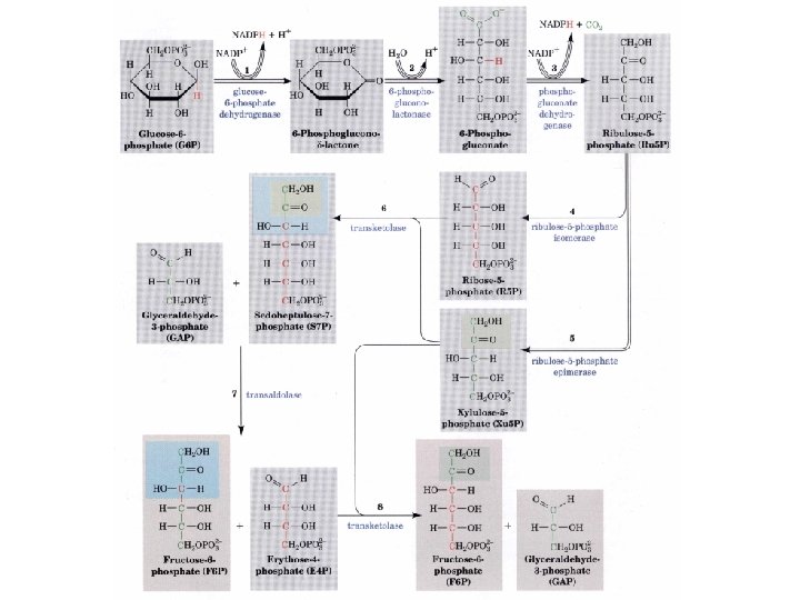 The pathway consists of three parts 1. Oxidative reactions: 3 G-6 -P + 6 NADP+ + 3 H 2 O 3 Ribulose-5 -PO 4 6 NADPH + 3 CO 2 + 2. Isomerization and epimerization reactions: 3 Ribulose-5 -PO 4 Ribose -5 -PO 4 + 2 Xylulose-5 -PO 4 3. A series of C-C bond cleavage and formations: Ribose-5 -PO 4 + 2 Xyluose-5 -PO 4 2 F-6 -P + GAP
