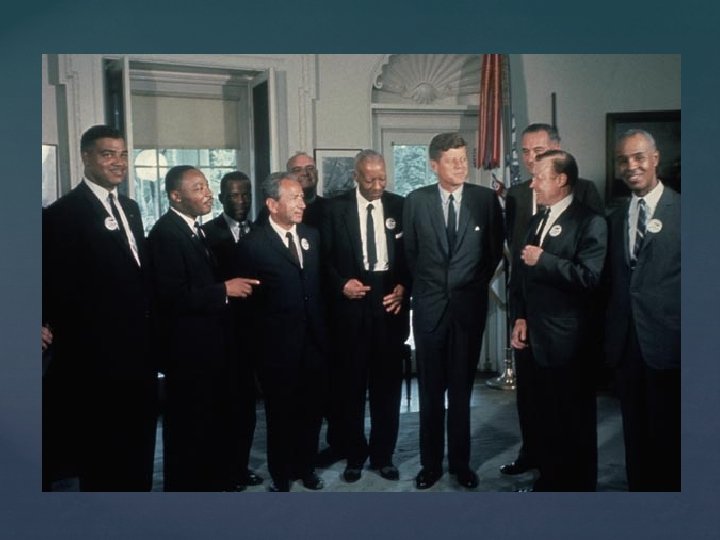 In conjunction with the SCLC, local activists I Birmingham, Alabama planned a large desegregation campaign Public Safety Commissioner “Bull” Connor jailed 100 s of demonstrators, including MLK King’s Letter from a Birmingham Jail set out the issues at stake and criticized his denouncers: “Wait has almost always meant Never…and justice too long delayed is justice denied” Connor’s forces used water cannons, attack dogs and clubbed the demonstrators, many children, which was seen on national TV May 10: a settlement was negotiated to stop the demonstrations and desegregate businesses and public facilities Birmingham (May, 1963)