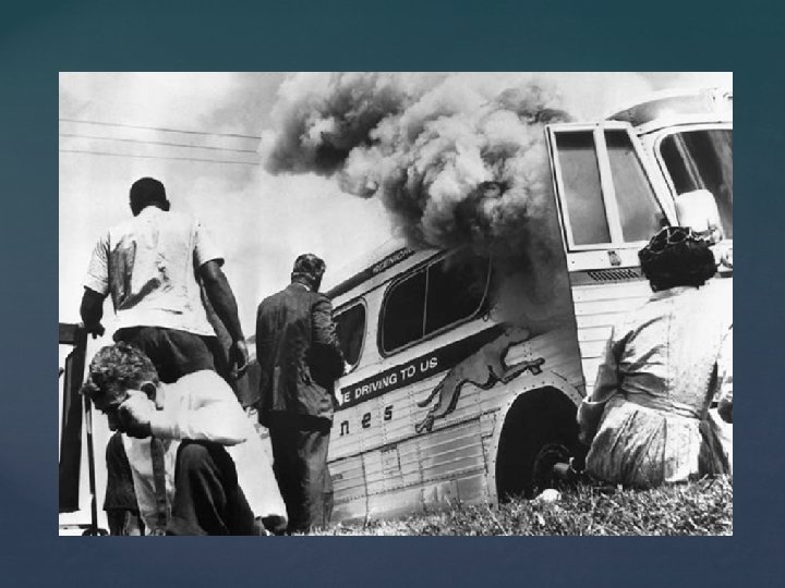 Congress for Racial Equality (CORE) sponsored a freedom bus ride of biracial teams to ride interstate busses in the South The FBI and Justice Depts. knew of the plans but were absent when mobs firebombed a bus and beat the Riders No police protection at other stops only worsened the violence Kennedy was forced to mediate a safe conduct for Riders, though 300 of them were arrested for “inflaming public opinion” The Justice Department petitioned the ICC to end segregation on interstate busses (1962) The violence also indicated that the federal government was not fully committed to enforce these laws The Freedom Rides