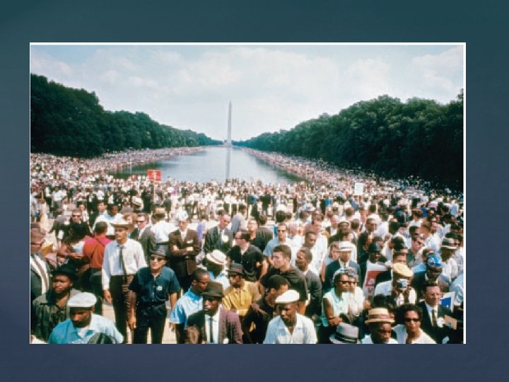The shifting public consensus led JFK to appeal for civil rights legislation in a televised address on June 11, 1963 A. Philp Randolph’s old idea of a march on Washington was revived (remember WWII) The march presented a unified call for change and held up the dream of universal freedom and brotherhood (August 28, 1963) The event was climaxed by MLK’s famous “I Have a Dream” speech JFK and the March on Washington