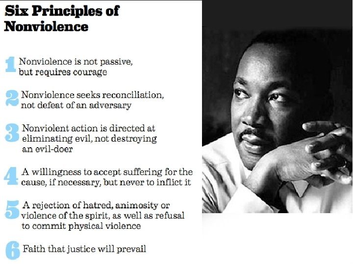 Is it possible for nonviolent direct action to transform a community? 1. Receive either a copy of “The Six Principles of Nonviolence” and “Six Steps of Nonviolent Direct Action. ” 2. Why do you think MLK wrote the “The Six Principles of Nonviolence”? 3. Why do you think MLK wrote the “Six Steps of Nonviolent Direct Action”? 4. Why do you think people you participate in direct action needed to be educated in nonviolence? NOTE: You will connect your learning in the unit to the six principles/six steps as you learn the story of the US Civil Rights Movement
