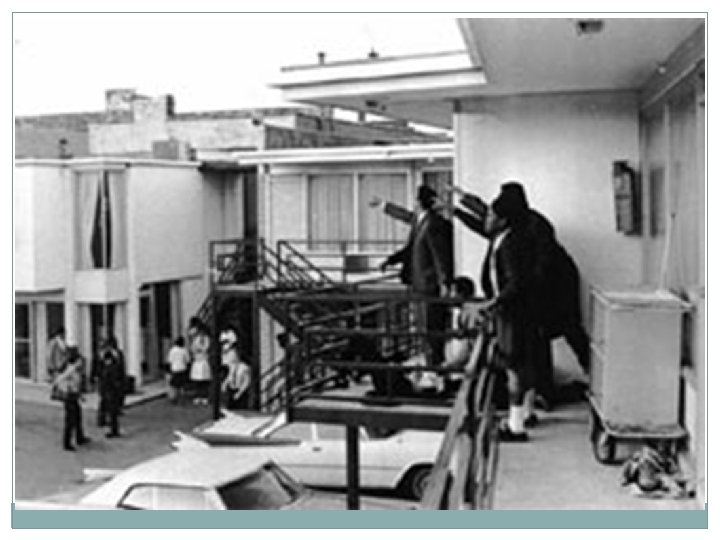 Loss of THE Leader �King made another speech in Memphis, Tennessee, on April 3, 1968. �This is were he said, “We’ve got some difficult days ahead, but it really doesn’t matter to me now, because I’ve been to the mountaintop. ” �The next evening, on April 4 th, 1968, he was gunned down by James Earl Ray, as he stood on the balcony of his Memphis motel. �The country engaged in a week of looting, rioting, and burning as a result of King’s death.