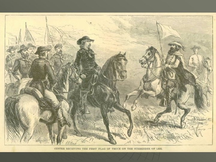 Lee Surrenders at Appomattox n With his army starving and getting smaller every day, Lee eventually meets with Grant to sign terms of surrender in Appomattox Courthouse, Virginia