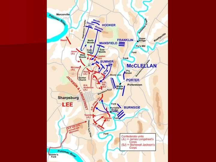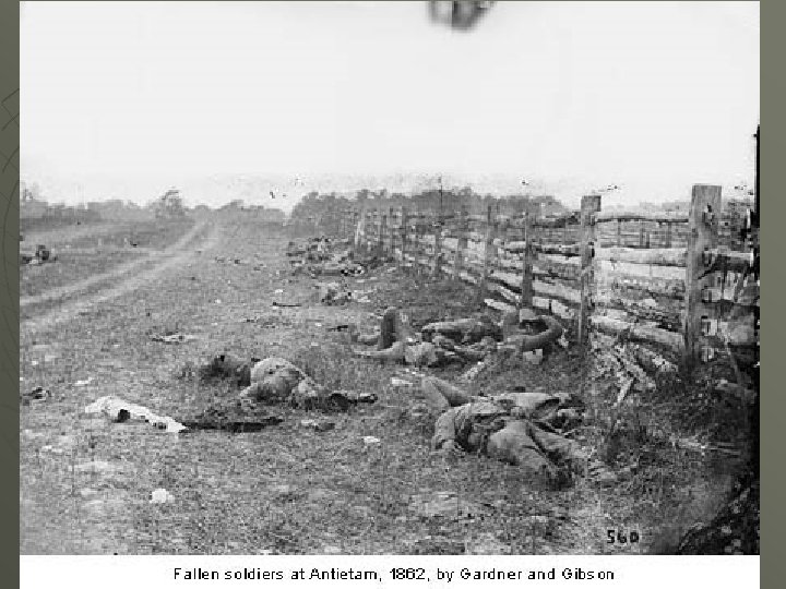 Additional information on Antietam n Mid-September 1862, in Maryland n Union “victory”, led by Mc. Clellan n Lee’s battle plans wrapped around a cigar pack that a Confederate soldier had dropped were found by the Union n Gave Lincoln the opportunity to issue the Emancipation Proclamation, which strengthened the moral cause of the war