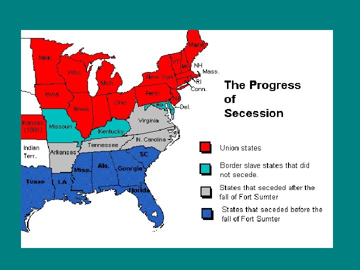 Sectional Differences Issues Economic Factors North • Agriculture & industry • Immigrant labor South • Agriculture • Slave labor Slavery Issue • Abolitionists • Pro-slavery • Favored entry of free • Favored entry of slave states Compromise of 1850 • California admitted as a free state • Slave trade abolished • Utah and New Mexico Territories opened to slavery The Election of Lincoln • Supported by North and West • Alienated the South