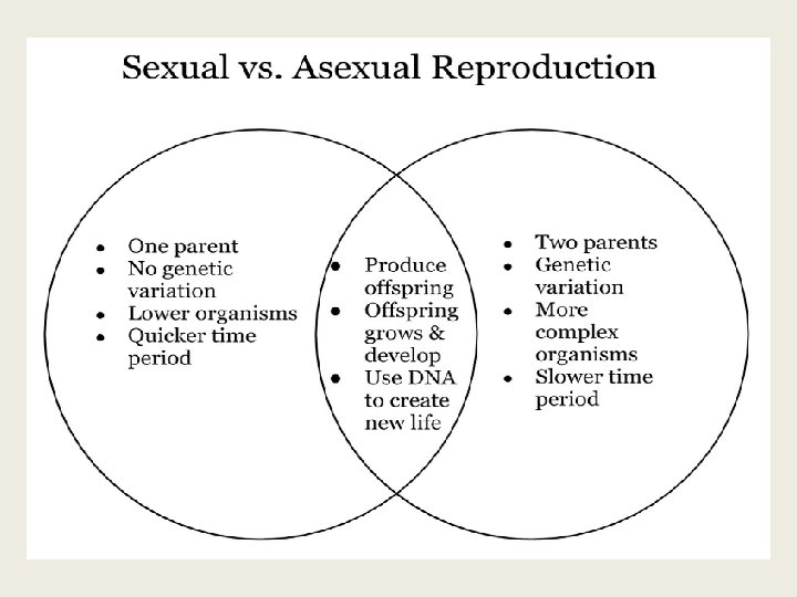 4. Whether they reproduce sexually or asexually Asexual reproduction is a process that only involves one parent, not two. Sexual reproduction is a process that involves a combination of genetic material from two parents – a male and a female.