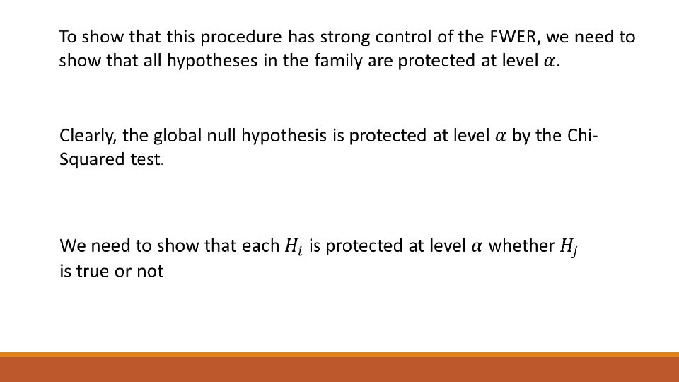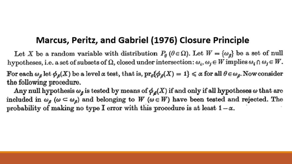 References HOCHBERG, Y. (1998). A sharper Bonferroni procedure for multiple tests of significance. Biometrika, 75 (4), 800– 802. HOCHBERG, Y. , & TAMHANE, A. C. (1987). Multiple Comparison Procedures. New York: Wiley. HOLM, S. (1979). A simple sequentially rejective multiple test procedure. Scandinavian Journal of Statistics, 6, 65 -70. HOMMEL, G. (1988). A stagewise rejective multiple test Procedure based on a modified Bonferroni test. Biometrika, 75 (2), 383 -386. Jiangtao G. , t C. Tamhane, A. C. , Xi, D. & Rom, D. (2014). A class of improved hybrid Hochberg–Hommel type step-up multiple test procedures. Biometrika (To Appear). MARCUS, R. , PERITZ, E. , & GABRIEL, K. R. (1976). On closed testing procedures with special reference to ordered analysis of variance. Biometrika, 63 (3), 655 -660. Sarkar, S. K. Generalizing Simes’ Test and Hochberg’s Step UP Procedure. (2008) The Annals of Statistics, 36 no. 1, 337 --363. Sarkar, S. K. Some probability inequalities for ordered MTP random variables: a proof of the Simes conjecture. (1998) The Annals of Statistics, 26 no. 2, 494 --504. SIMES, R. J. (1986). improved Bonferroni procedure for multiple tests of significance. Biometrika, 73 (3), 751754.