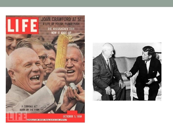 Cuban Missile Crisis • In 1962, American leaders discovered Cuba was secretly building bases to install Soviet missiles with nuclear warheads. • These would be within striking distance of US cities. • During the “Cuban Missile Crisis, ” President Kennedy ordered a naval blockade of Cuba and threatened to invade if the missiles were not withdrawn • The world stood on the brink of nuclear war. • Khrushchev finally agreed to withdraw the missiles for a pledge that the United States would not invade Cuba. • Khrushchev’s failure in the crisis contributed to his removal from power in 1964