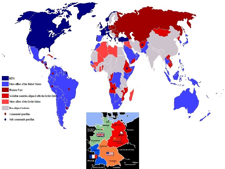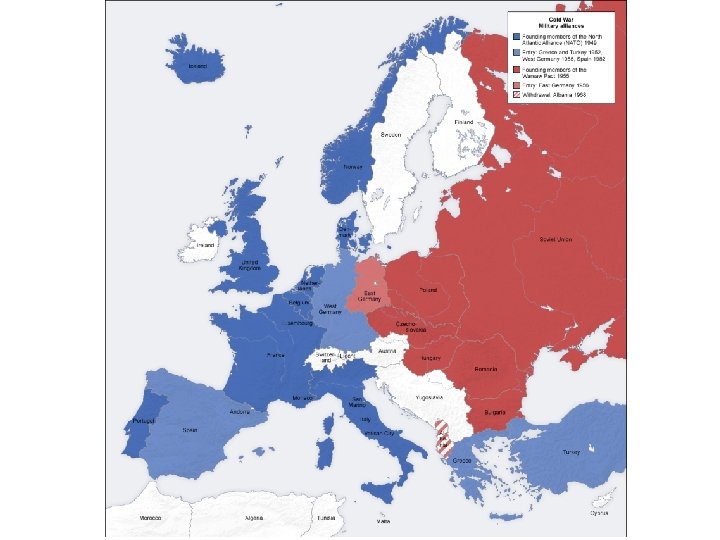 Alliances • Soviets created an alliance to promote and protect themselves which committed them to support communism and to resist the American sphere of influence during the Cold War (Warsaw Pact) • the Americans surrounded the Soviet Union with their own alliances in an attempt to contain the Soviet sphere i. e. prevent them from expanding (NATO, NORAD, SEATO, CENTO) • this alliance systems were a two edged sword which protected them, but also committed them to this struggle