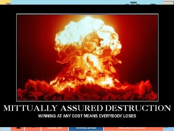 Militarism • concept of using military force to solve problems and being willing to go to war to promote a particular position • Cold War was about making military power a prominent point in each superpower's influence • 25% of each national budget was spent on weaponry during the Cold War (a huge sum of money) • they emphasized relying on their military strength • deterrence was a common objective; they wanted to put fear in the hearts of their potential enemies • MAD – Mutually Assured Destruction