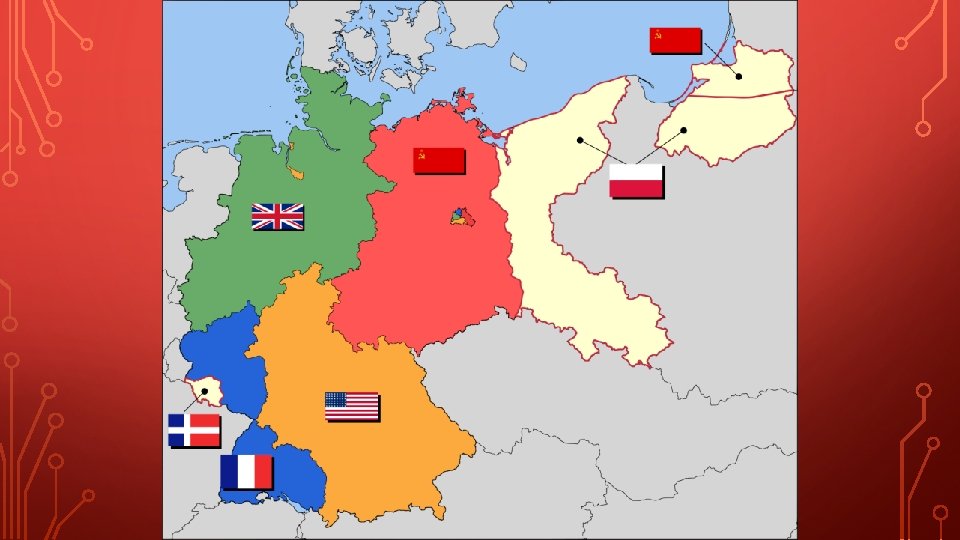 CRISIS IN GERMANY • Germany was divided into 4 zones but soon the country was split between democratic powers and communism • Germany became a major focus of Cold War tension • Allies had a plan to rebuild Germany’s economy, Stalin feared that they would lose power in Germany • Berlin Airlift: Stalin closed all land routes to West Berlin; democratic powers couldn’t bring essential goods to West Berlin • Soviet Union decided to build a wall dividing East and West Germany