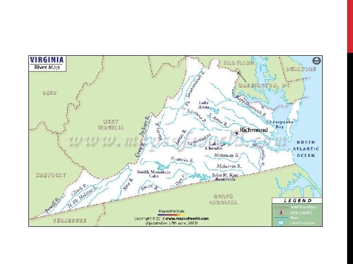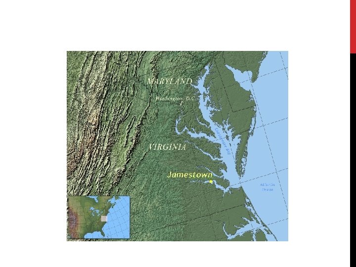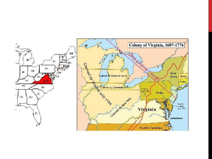 VIRGINIA • Jamestown was founded in 1607 by the British as a tobacco town. • Jamestown was the very first permanent European settlement in present-day America. • Through hard times, John Smith save the colony with his “don’t work, don’t eat” policy.