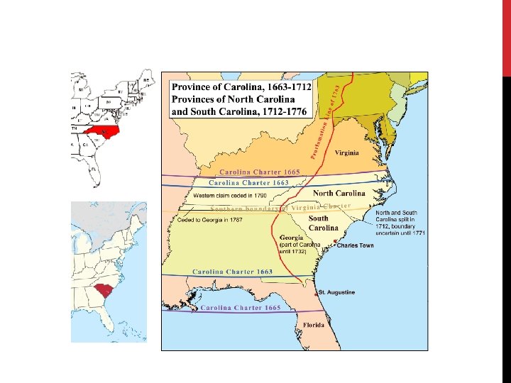 NORTH AND SOUTH CAROLINA • The Carolinas were founded as one unit, Carolina, in the 1660’s. • A charter from Charles II allowed for the creation of the colony. • The north was more democratic while the south was economically more advanced with a greater focus on plantations.