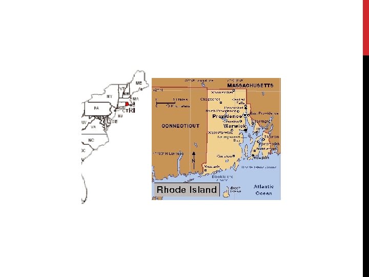 Rhode Island • Rhode Island was founded by Roger Williams as a haven for the Baptists. • Roger Williams advocated for fair treatment of the Native Americans and some religious tolerance. • After he and Anne Hutchinson were expelled from Massachusetts for their religious beliefs.