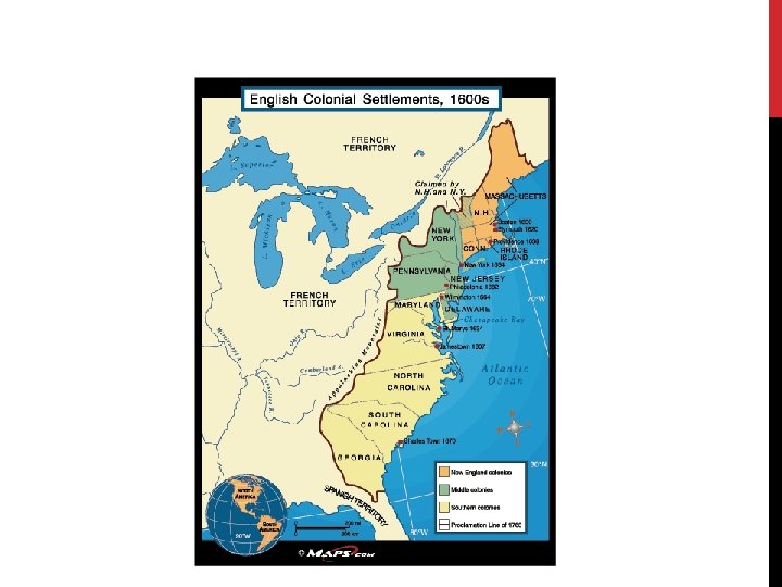 COLONIES COMPARED TO ENGLAND • Better off economically • Higher standard of living • More religious and political freedom • More economic opportunity • Same rights as the British (as stated in the Jamestown Charter) • 3000 miles away from home