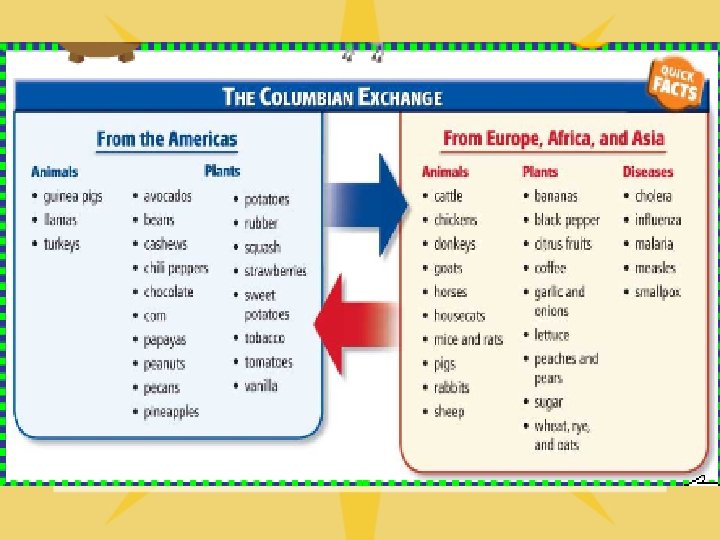 Effects of Diseases l l l Native American population dramatically decreases Europeans need labor to cultivate new crops in the Americas, but there aren’t many natives left. Europeans look to Africa & begin to import African slaves to the Americas.