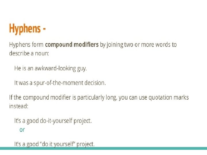 Question Mark (? ) Cont’d Note that you put a question mark at the end of a question, even if the words in the sentence are not in the normal question order, or some words are omitted. Care is needed here as such a sentence can look, at first sight, like a statement rather than a question. Example: You know he doesn’t live here any longer?