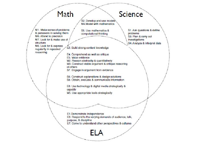 Major Shifts in New Standards ELA • • • Regular practice with complex text and its vocabulary Building knowledge through content-rich informational texts Emphasis on reading, writing, and speaking that is grounded in evidence from the text Math • • • Science Provide opportunities for • student access to the different mathematical • (discourse) practices described in the CCSS Support mathematical discussions and use a variety of participation structures • Focus on students’ mathematical reasoning, • NOT on students’ flawed or developing language Developing and using models Constructing explanations (for science) and developing solutions (for engineering) Engaging in argument from evidence Obtaining, evaluating, and communicating information