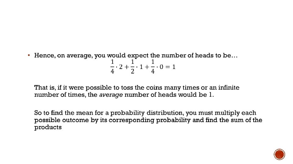 § Suppose two coins are tossed repeatedly, and the number of heads that occurred is recorded. What will be the mean of the number of heads? § What is the sample space? § What is the probability for each outcome in the sample space? § Probability of one head? § Probability of two heads? § Probability of no heads?