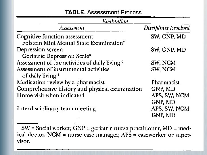 Comprehensive Geriatric Assessment w w w Process intended to determine a patient’s medical, psychosocial, and functional capabilities and limitations Goal is to develop an overall plan for treatment and longterm follow-up Implemented by a highly-trained team