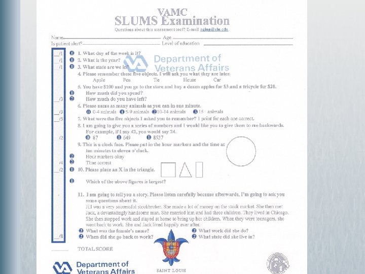 Comprehensive Geriatric Assessment w w w w Screen for Depression: Geriatric Depression Scale (GDS) Screen for Cognition: MMSE, SLUMS (slide 9), Mini-Cog Functional Status: Activities of Daily Living (ADLs) and Instrumental Activities of Daily Living (IADLs) (see slide 10) Mobility Status: Get Up and Go Test (see slide 11) Nutritional Assessment: Mini Nutritional Assessment Medication Review Comprehensive History and Physical Exam