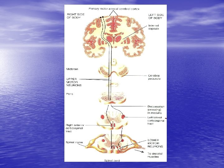 Lateral and anterior corticospinal tracts • first neurons are in • giant pyramidal cells of higher two thirds of the precentral gyrus second neurons are in motor nucleuses of the anterior horn