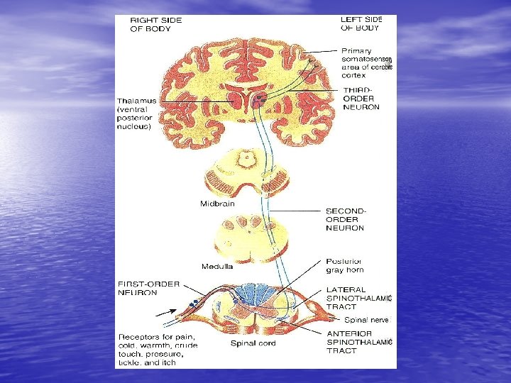 Conductive tract of touch and pressure sensitivity – anterior spino-thalamical tract • The receptor is situated in the • • • skin first neuron (pseudounipolar cells) is in spinal ganglion second neurons are located in the substantia gelatinosa of the posterior horn of the spinal cord the third neurons cells are situated in the dorsal latersl nucleus of the thalamus