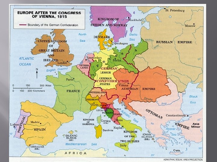 The Containment of France To keep France contained, several new states / politcal entitities were created along France’s borders, making them stronger: Ø Kingdom of the Netherlands established by joining together the former Austrian Netherlands and Dutch Republic. Ø German Confederation created by joining together 39 German states. Ø Switzerland was made an independent state. Ø Kingdom of Sardinia in Italy was strengthened by the addition of Genoa.