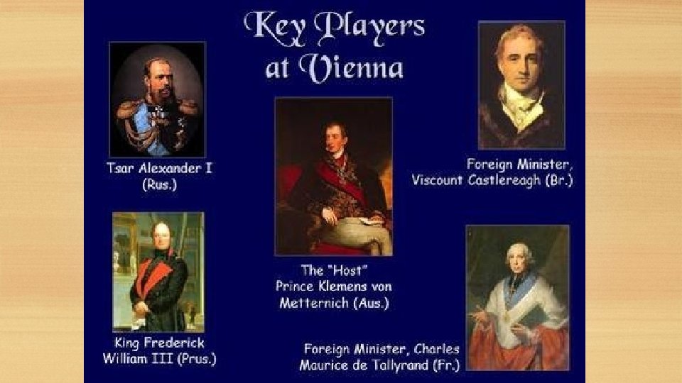 Metternich’s Plan for Europe Most decisions were made in secret among representatives of the five “great powers” – Russia, Prussia, Austria, Great Britain, and France. The most influential of these representatives: Prince Klemens von Metternich, Austrian foreign minister Metternich distrusted the democratic ideals of the French Revolution. Viewed Napoleon’s behavior as the outcome of experiments with democracy. Metternich’s goal: “The first and greatest concern for the immense majority of every nation is the stability of laws – never their change. ”