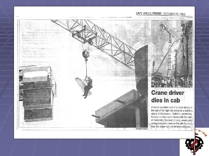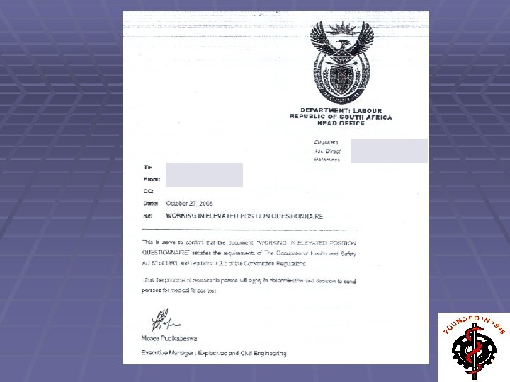 The Regulations – Occupational Health Aspects § promulgated on 18 July 2003 § employers are obliged to ensure that employees, in certain occupations, are in possession of medical certificates of fitness § § § Employees on supported or suspended platforms (15)(12)(a) Crane operators (20)(g) Operators of all construction vehicles and mobile plants (21)(1)(d)(i) § Under the Fall Protection Plan § The employer is required to ensure there is a process for evaluating the physical & psychological fitness to work at elevated positions CR(8)(2)(b)