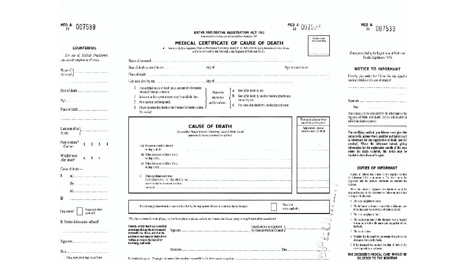 DEATH Cause of death natural and known Cause of death not known or unnatural Refer to Coroner: enquiries Clinician issues MCCD Autopsy Form A Form B Consented autopsy Family take MCCD to Registrar of Deaths Cremation form Open investigation Discontinue investigation Record of Inquest sent to Registrar Open inquest Body can be collected, buried, cremated or repatriated