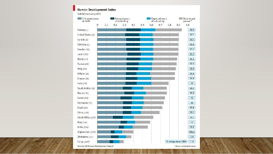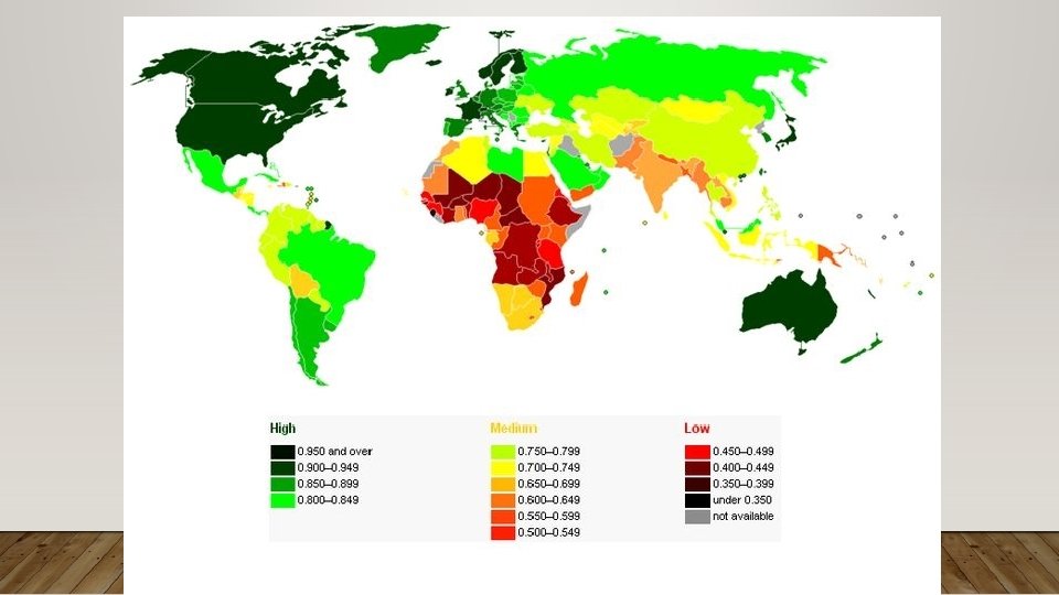 HUMAN DEVELOPMENT INDEX (HDI) • The Human Development Index (HDI) measures a country’s level of development in terms of: 1. life expectancy; 2. education; and 3. standard of living. • Looking at the graph, which parts of the world have a high level of human development? • Which ones have a low level of human development?