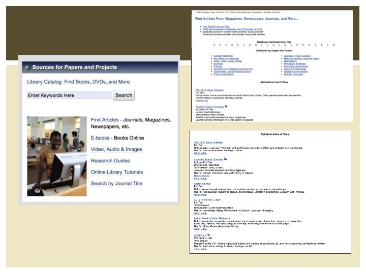 LOCATING SOURCES IN THE LIBRARY The Library can be a good place to help focus your research source hunting. Libraries and Librarians not only have access to Databases that you have access to, they can help you focus or expand your research. Online resources for Collin College Library: § https: //cougarweb. collin. edu/web/home-community/library Let’s look a bit closer at this resource