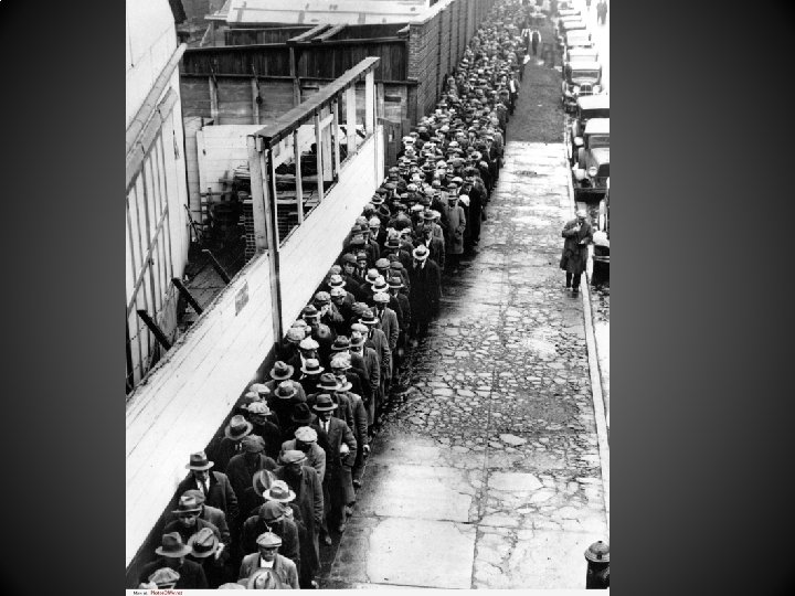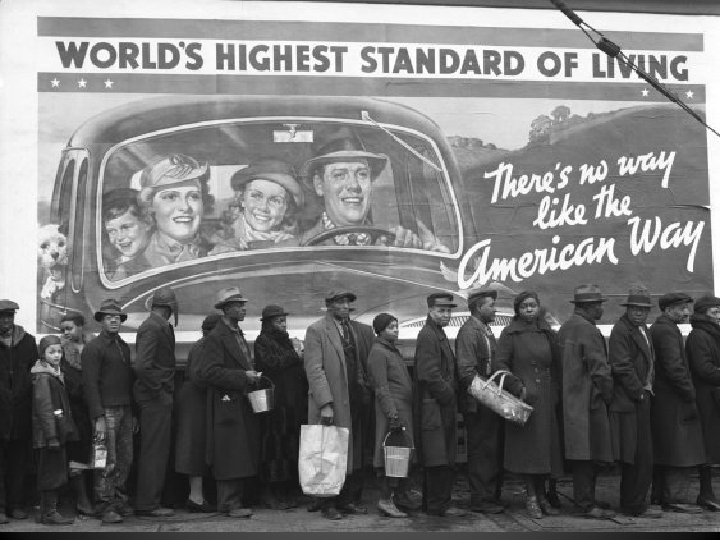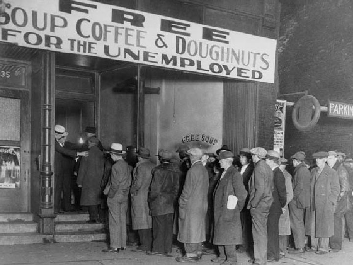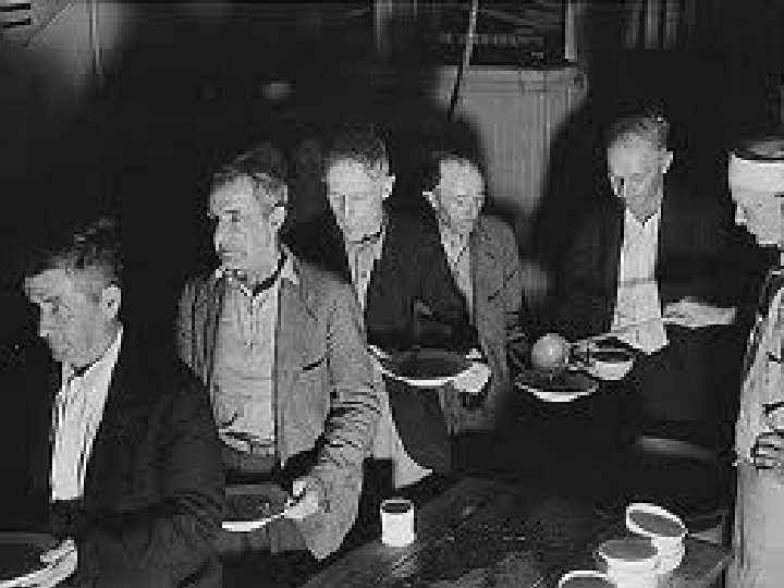 The Great Depression • The collapse of the Stock Market set in motion the collapse of the nation’s banking institutions which, in turn, led to the ruin of companies and families alike. Living under the myth that “everyone ought to be rich” in this new perfect consumer economy lured many into extremely risky financial decisions. • Now, the fallout of the crash: a full 1/3 of the nation has lost everything… including the ability to provide for their most basic needs.