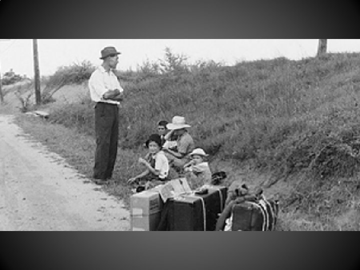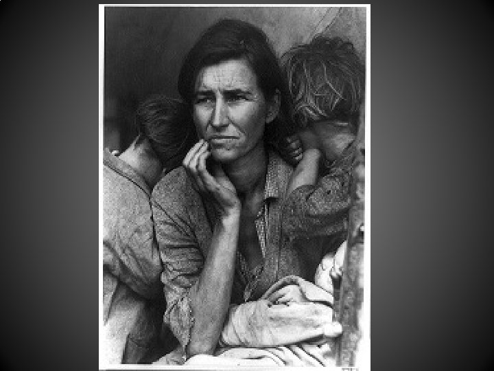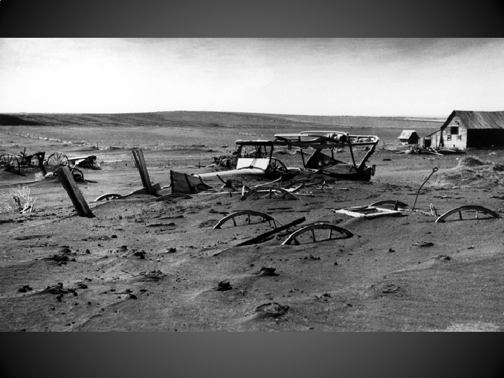 Agricultural Overproduction creates an Environmental Disaster • During the 20 s huge portions of the Great Plains were put to the plow for the first time using new machines. Simultaneously, a drought struck. With no grass on the plains to hold the surface soil in place, the dry winds began to lift the dried soil (now dust) into the air. Dust storms covered hundreds of miles and lasted for days at a time. Some of the most fertile soil on earth just blew away in the wind… a true ecological disaster.