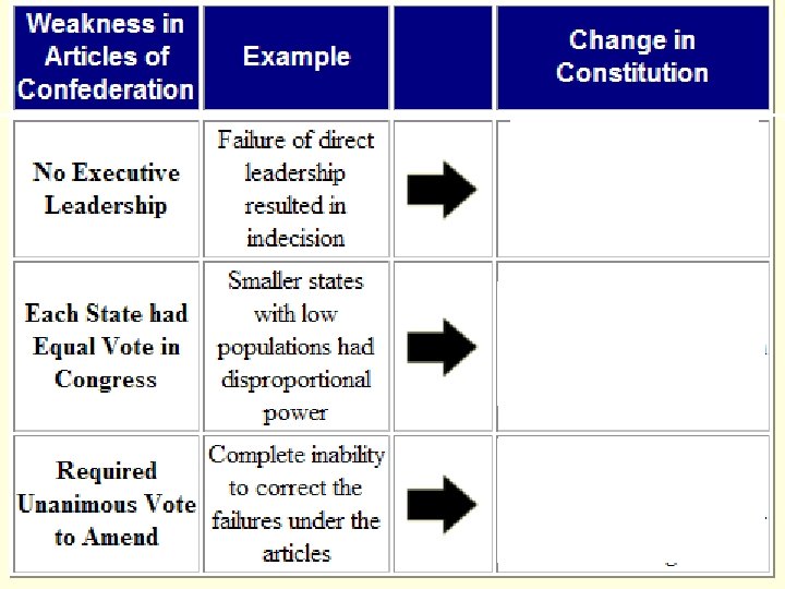 Shays’ Rebellion: # Effects Short – Term Effects (1787 – 1788) 1) Fear by the minority, upper class that the majority lower class would threaten their status & property. Long – Term Effects (1789 – Present) 5) Federal government is given the power to raise & maintain an army in the U. S. Constitution. 6) X 2) Realized the federal government under the Articles of Confederation could not deal with insurrection. 3) Call for a convention to revise the Articles of Confederation. 4) Nationalists called for a strong central government.