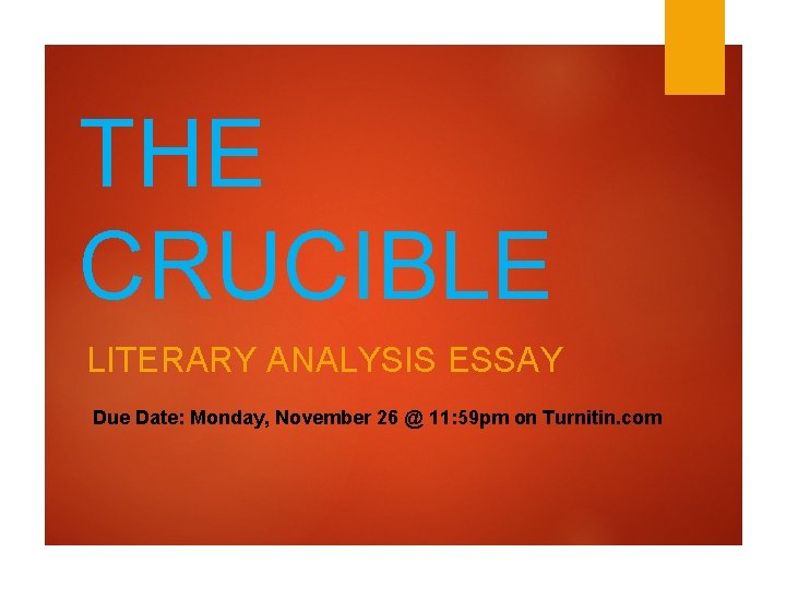 THE CRUCIBLE LITERARY ANALYSIS ESSAY Due Date: Monday, November 26 @ 11: 59 pm on Turnitin. com