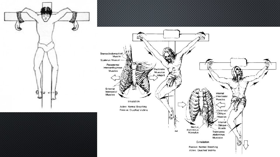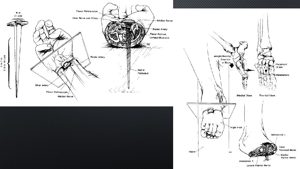 ROMAN CRUCIFIXION • 3 RD PHASE • HANDS WERE BOUND/NAILED AT WRISTS/FOREARM • FEET WERE BOUND/NAILED AT SIDES OR FRONT • NAILS WERE 5 -7 INCHES IN LENGTH • SIGN WAS ATTACHED ABOVE VICTIM’S HEAD