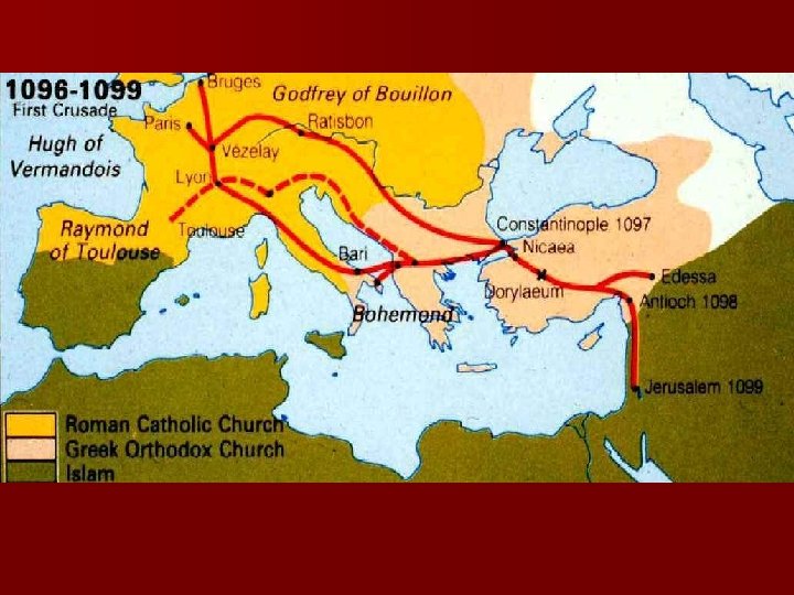 The First Crusade: 1095 -1099 Armies were divided into four groups all set to meet in Constantinople: 1. Godfrey of Bouillon: Duke of Lower Lorraine, led the people of Lorraine [Germans, and Northern Frenchmen] (uncle of St. Norbert!) 2. Hugh of Vermandois: Duke of Normandy (son of William the Conqueror and brother of King Philip I of France) led bands of French and Normans. 3. Raymond of Saint-Gilles and Adhemar of Moneil (Bishop of Puy): led the Southern French. 4. Bohemund and Tancred: led Normans from southern Italy. Both are related to Robert Guiscard, the founder of Norman Sicily. • All armies, with some delays, arrived in Constantinople by April of 1097.
