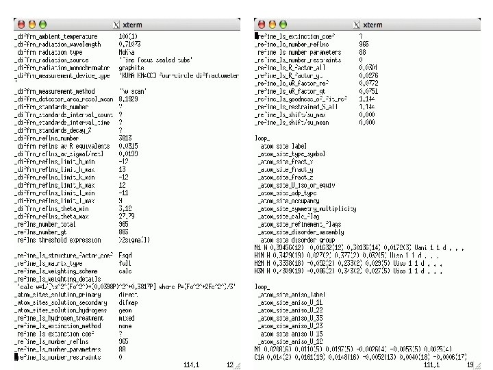 Constructs • data_name where name the choosen identifier of the data • Data associations e. g. _ cell_length_a 16. 6392(2) • Repetition (loop) loop_ __symmetry_equiv_pos_as_xyz ‘x, y, z’ ‘-x, y+1/2, -z’
