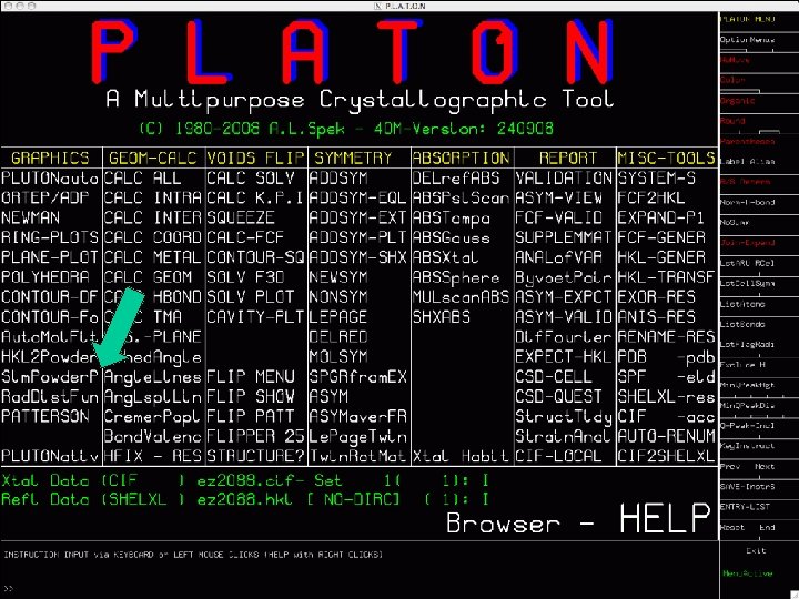 Display Options • Ball-and-Stick Simpel but may hide problems with a structure. • ORTEP Often preferred because it visualizes most model parameters and possible problems. • CPK Spacefilling PLOT illustrating the shape etc