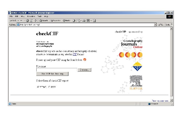 How is Validation Implemented • Computer readable structure analysis results in CIF format (Syd Hall & George Sheldrick) • A file (Check. def) defines the issues that are tested with levels of severity and associated explanation and advise. • The tests are executed by the program PLATON • The tests can be executed both in-house or through the WEB-based IUCr CHECKCIF server.