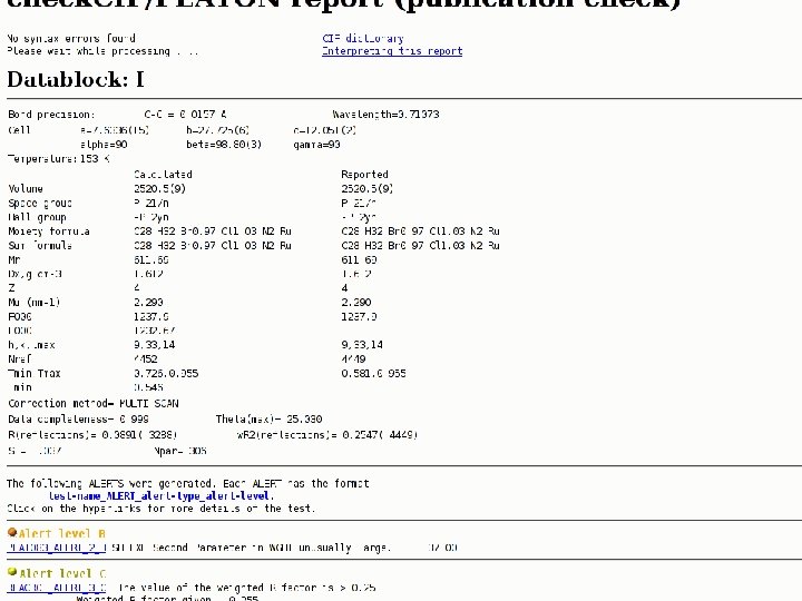 ALERT LEVELS Check. Cif Report in terms of a list of ALERTS • • ALERT A – Serious Problem ALERT B – Potentially Serious Problem ALERT C – Check & Explain ALERT G – Verify or Take Notice