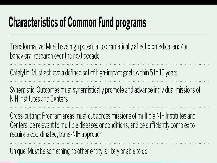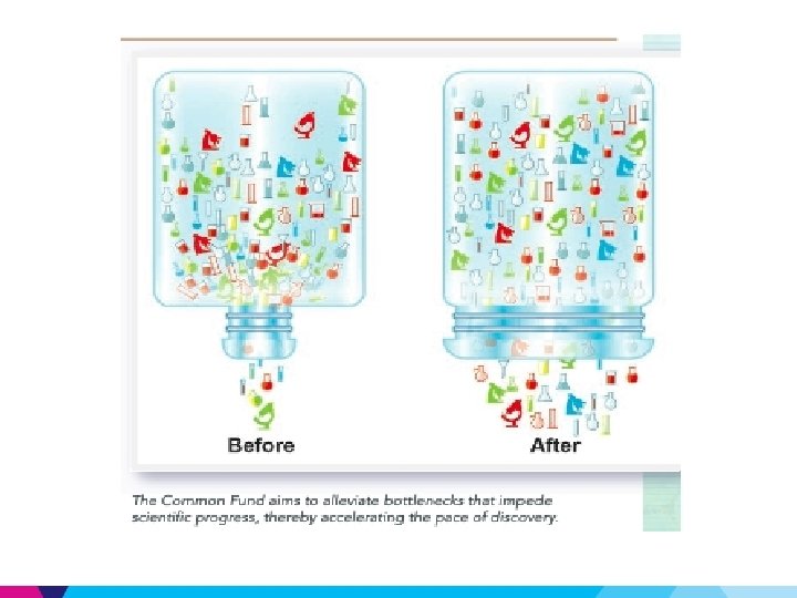 Funding for the Road. Map Initiatives • NIH Institutes & Centers contributed to a common pool of resources and a plan as to how these resources would be utilized • Administered centrally • implemented by Working Groups composed of staff from multiple NIH Institutes or Centers • Institutionalized a corporate process for decisionmaking about priorities that span the breadth of the NIH. • NIH Reform Act (2006) provided continued support for Roadmap programs through the NIH Common Fund