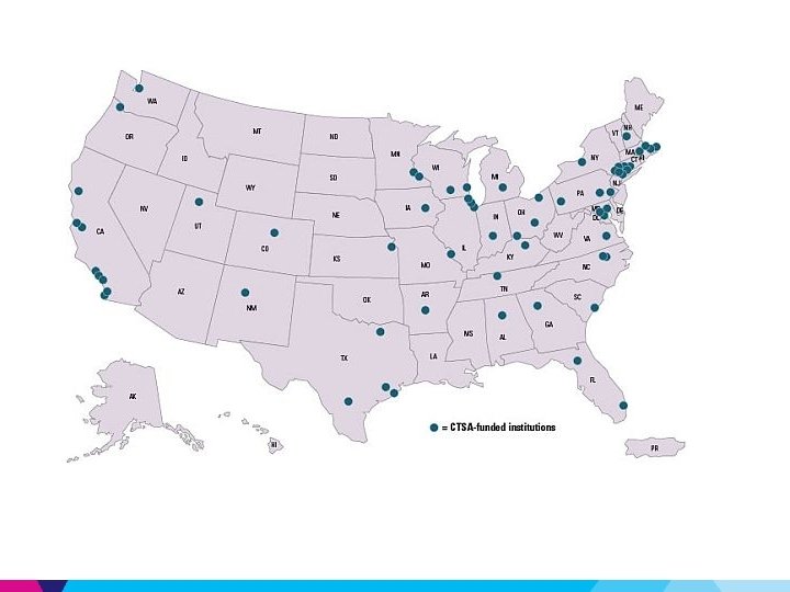 Clinical and Translational Science Award (CTSA): what is it? • An NIH infrastructure grant in support of a matrixed CT research enterprise, designed to accelerate the ability to harness the promise of discovery science to solve problems of human health in impactful ways & to speed bench to bedside translation of scientific discoveries • A funding vehicle to support health improvements for society at large through innovative transdiciplinary research programs & partnerships